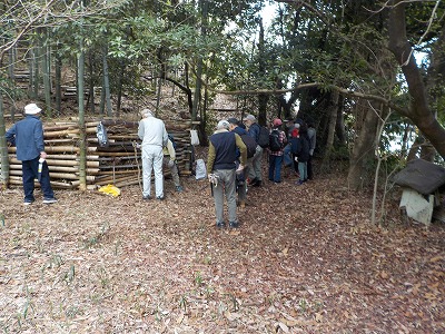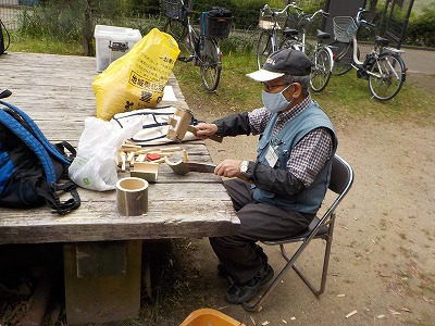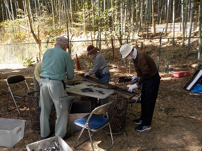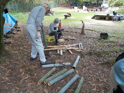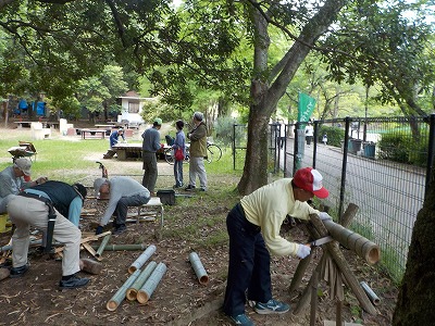 6日(月)9:30〜12:00 オープン日。会員は間伐及び竹炭焼き用材作り。一般参加の工作希望者にも対応しました。エンピツ立て、花びんなど楽しんでおられました。