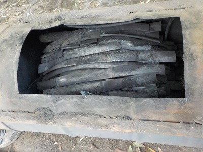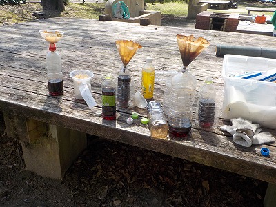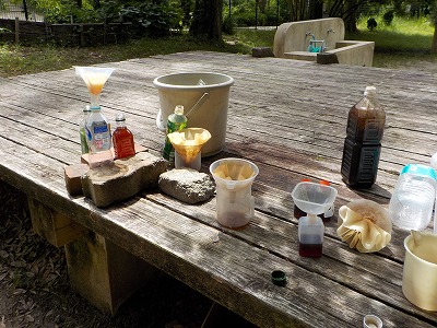 | 竹炭をカット&ブラッシング | 自然工作の材料作り | 竹酢液の精製作業中 |