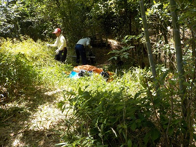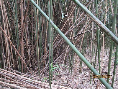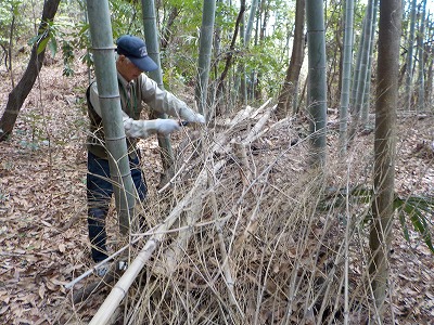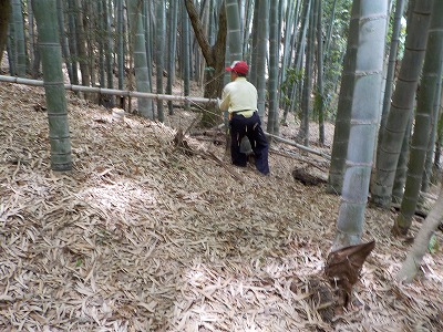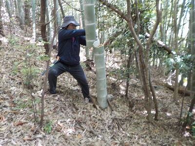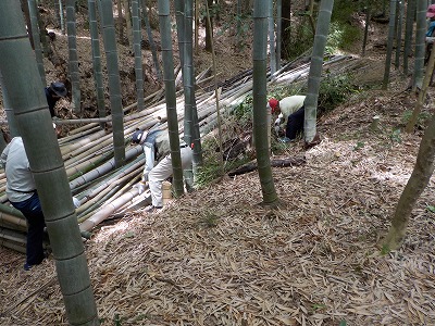| 窪地での作業 | 太〜い竹を切りました | 枝も丁寧に処理 |