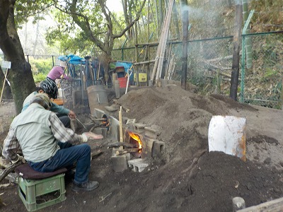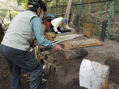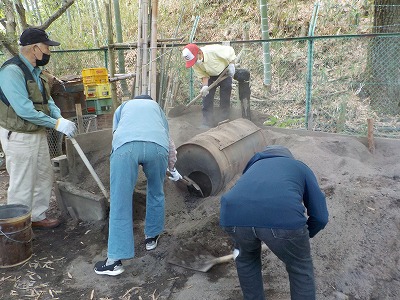 16日(木)9:00〜17:00 千里中央公園 竹炭焼き第1日目窯入れ。順調に温度上昇させることができました。あおぎ手を交代しながら、合間に他の作業も併せて進めました。