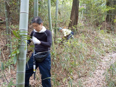 25日(土)9:30〜12:30 千里緑地(新千里北町) 竹の間伐作業。斜面での作業はかなりキツイ。竹を減らすため力一杯・