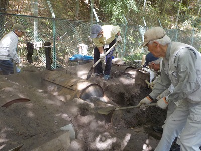 17日(金)9:30〜12:30 千里中央公園 竹炭焼き第2日目、窯出し。竹炭の出来はグッド一安心でした。片付けが済んだ後は年に一度のお楽しみ会で懇親を深めました