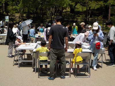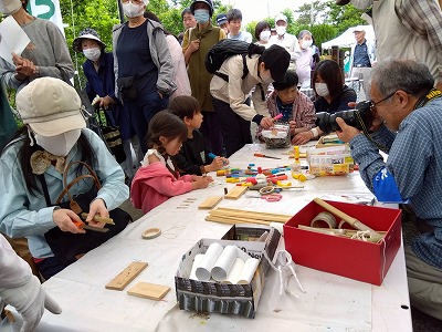 27日(土)10:00〜14;00 花と緑の相談所にてスプリングフェスタに参加。自然工作および、竹炭の無料提供、竹製品展示。工作は紙筒ロケット、ブンブンコマ、竹けん玉を作り楽しんでもらいました。また先着の方へは飲料用竹炭をさし上げました。