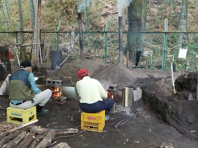 | 2窯とも点火、一生懸命あおぎます | 煙には勢いが見られ順調 | 2窯とも竹酢液を採取中 |