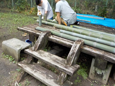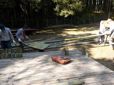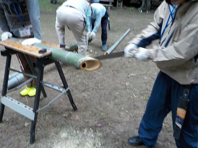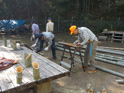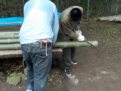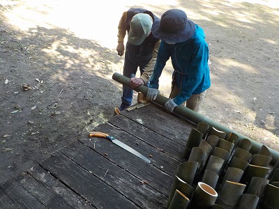 | 竹を切るために小道具も用意した会員 | 2人での作業の方が効率的 | こちらでもポットつくり竹 | 本日分の成果です |
