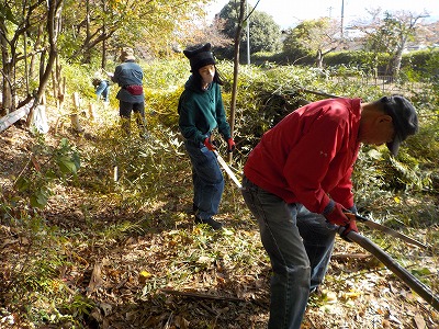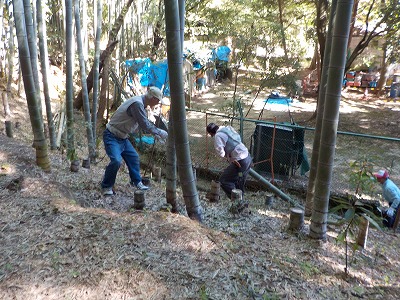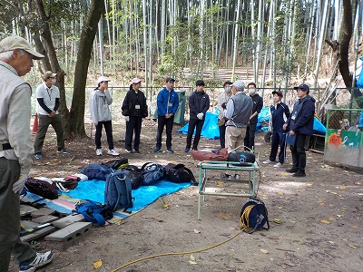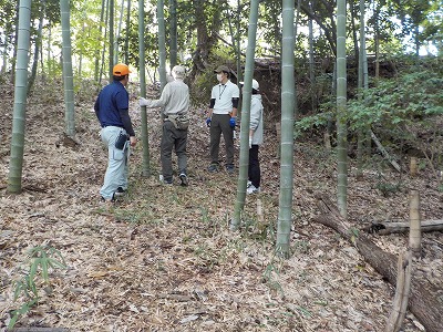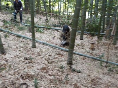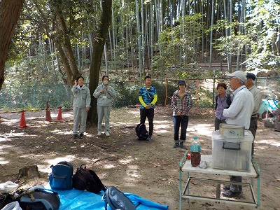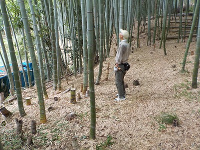 | 職員さんと朝のご挨拶 | 竹林に入って早速竹切り | 会員がミニレクチャーしています |