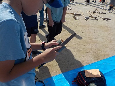 | 竹を切るって難しい! | 切った後の始末も一苦労 | ペアでの作業はいかがでしたか? | しっかり支えるとノコが使いやすい |