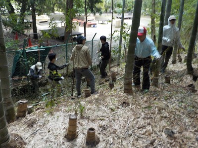 | 斜め切りはさらに難 | 午後からは竹林の整備 | キャンドルで使い残した枝葉の処理 | 合間に会員がごみ拾いもしていました |