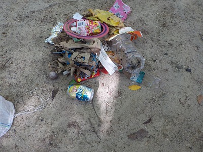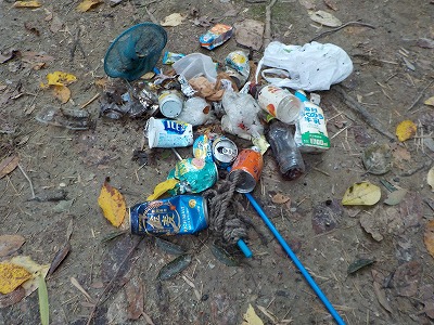 | 使わなかった竹も林内へ | 竹のリレーで集積場へ | 林内清掃で集めたゴミです |