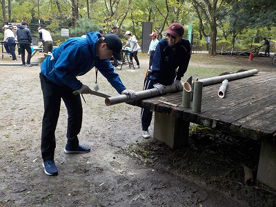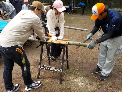 29日(火)9:00〜15:00 千里中央公園。竹切りとキャンドルポット作り、竹林整備作業。キャリアブリッジのメンバーと共に作業を取り組みました。 ほとんどの若者は竹切りは初めてのようでなかなか苦労していました、午後には竹林整備(古竹の片付け)をメンバーと共に作業してもらいました。
