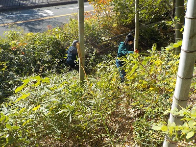 15日(火)9:30〜12:30 新千里北町 竹切り。府道沿いの竹を間伐し、気持ちの良い竹林へ前進途中。