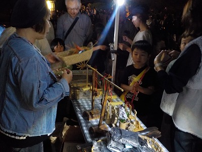 | オープニングの演奏 | 竹炭プロジェクト、開店 | 夜の売店はまるで”夜店” | 色付けした竹ポットに点火していきます |