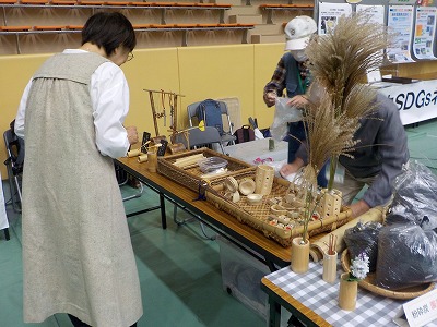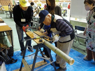 | 色々竹製品を用意しました | パネル前では活動の紹介 | パネルの内側ではのこぎり体験 | 竹を切ってエンピツ立て作りのお手伝い |
